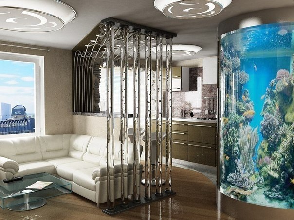 Все три варианта гостиных просто шикарны. Очень понравился первый: необычный и оригинальный. Даже аквариум смотрится здорово! Интересно, он настоящий или имитация?