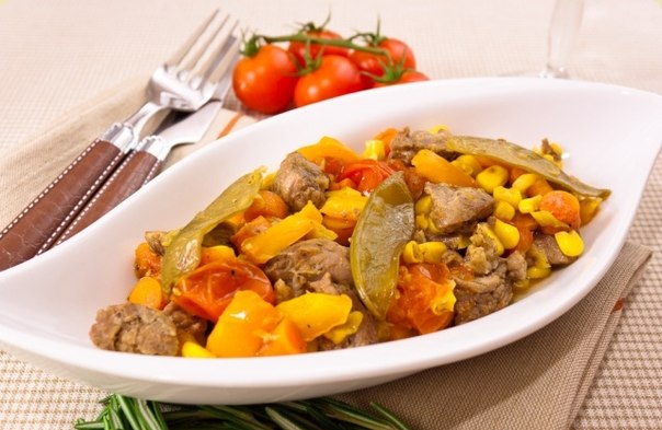 Говядина, запеченная с овощами 500 гр говядины нарезать мелкими кусочками, 150 гр лука нарезать кольцами, 200 г перца порезать соломкой, 200 гр помидоров нарезать кубиками, 200 гр морковки потереть. Форму для запекания смазать маслом растительным, выложить в нее мясо и овощи, добавить 200 гр мороженной кукурузы и 100 гр мороженного горошка, посолить, поперчить и поставить в духовку на 50 минут, чтоб не пригорало нужно форму накрыть фольгой