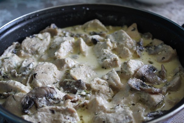 Обожаю куриное филе со сливками и грибами, нужно нарезать и потушить куриное филе (1 кг филе), 8 больших шампиньонов. Отдельно: выдавить 4 зубца чеснока, потереть 300 гр сыра, добавить укроп и залить 10% сливками, перемешать, в протушеную курицу влить смесь и тушить еще 10 минут
