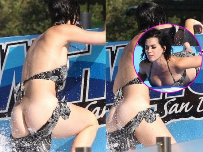 Популярная певица Кэти Пери (Katy Perry) никогда не страдала излишней стеснительностью, свое полуобнаженное тело звезда часто показывала в своих клипах. А совсем недавно, певица побывала на отдыхе в аквапарке, где вся публика смогла увидеть ее голую пятую точку. Никто и подумать не мог, что огромный купальник спадет с певицы, когда та будет выбираться из води и обнажит ее зад. Перри когда почувствовала неладное, попыталась, как можно быстрее исправить оплошность, но папарации уже успели запечатлеть это событие. Впрочем, Кэти произошедший с ней инцидент ничуть не смутил, и знаменитость даже мило поулыбалась папарации, запечатлевшим этот пикантный момент. Вот такие скромные наши знаменитости.