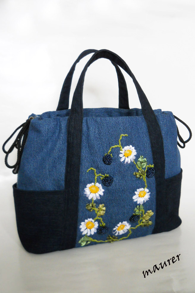 Сумка летняя. Материал джинс. Подкладка хлопок. Размеры: высота-26, длина-38, ширина-11. Одно отделение закрывается на магнитную кнопку. Два кармана снаружи и два внутри-накладной на резинке и большой на молнии. Вышивка атласными лентами и нитками ирис, объемная ежевика из бусинок. Вложение: