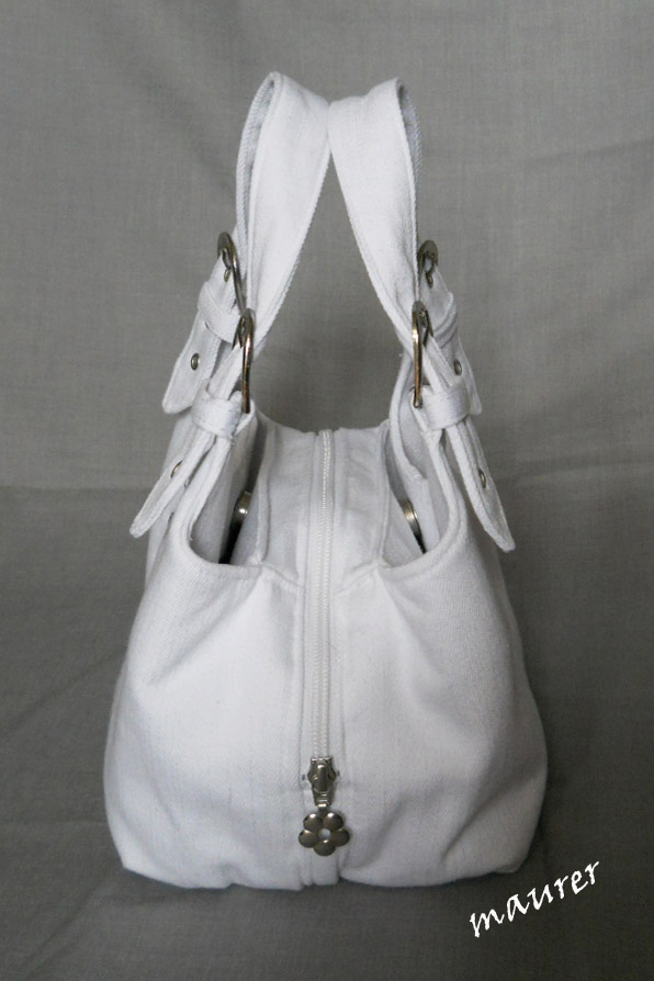 Белая джинсовая сумочка.Длина-25см,ширина-17см,высота-18см. Три отделения- два на магнитных кнопках и одно на молнии. Карманчик для мобильного телефона. Вложение: