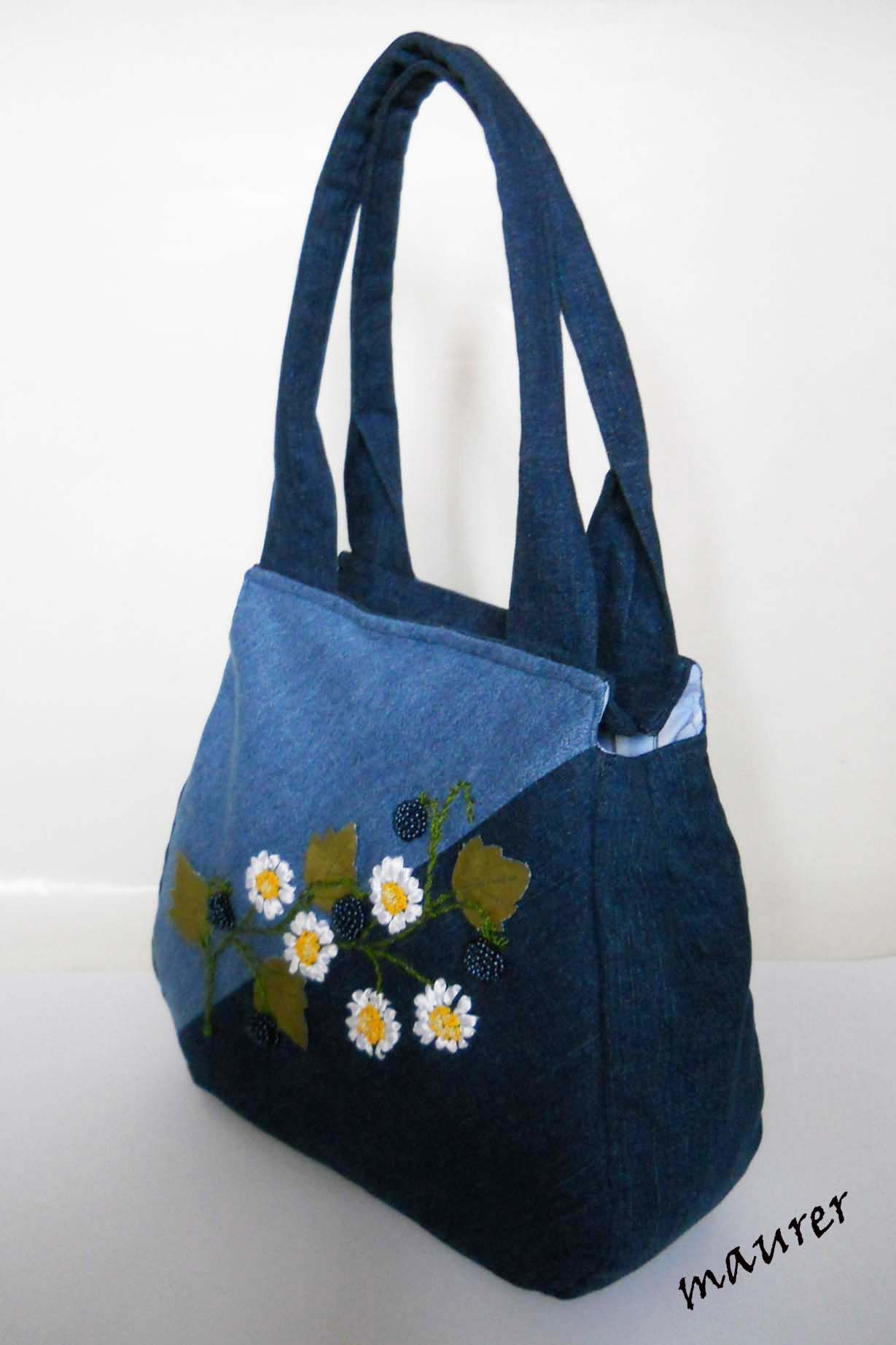 Джинсовая сумка. Размеры: высота-31,длина-34,ширина-13, ручки-58см. Подкладка хлопок. Накладной карман на резинке и карман на молнии. Листья замш аппликация. Объемные ягодки из бус и вышивка атласными ленточками и нитками ирис. Вложение:
