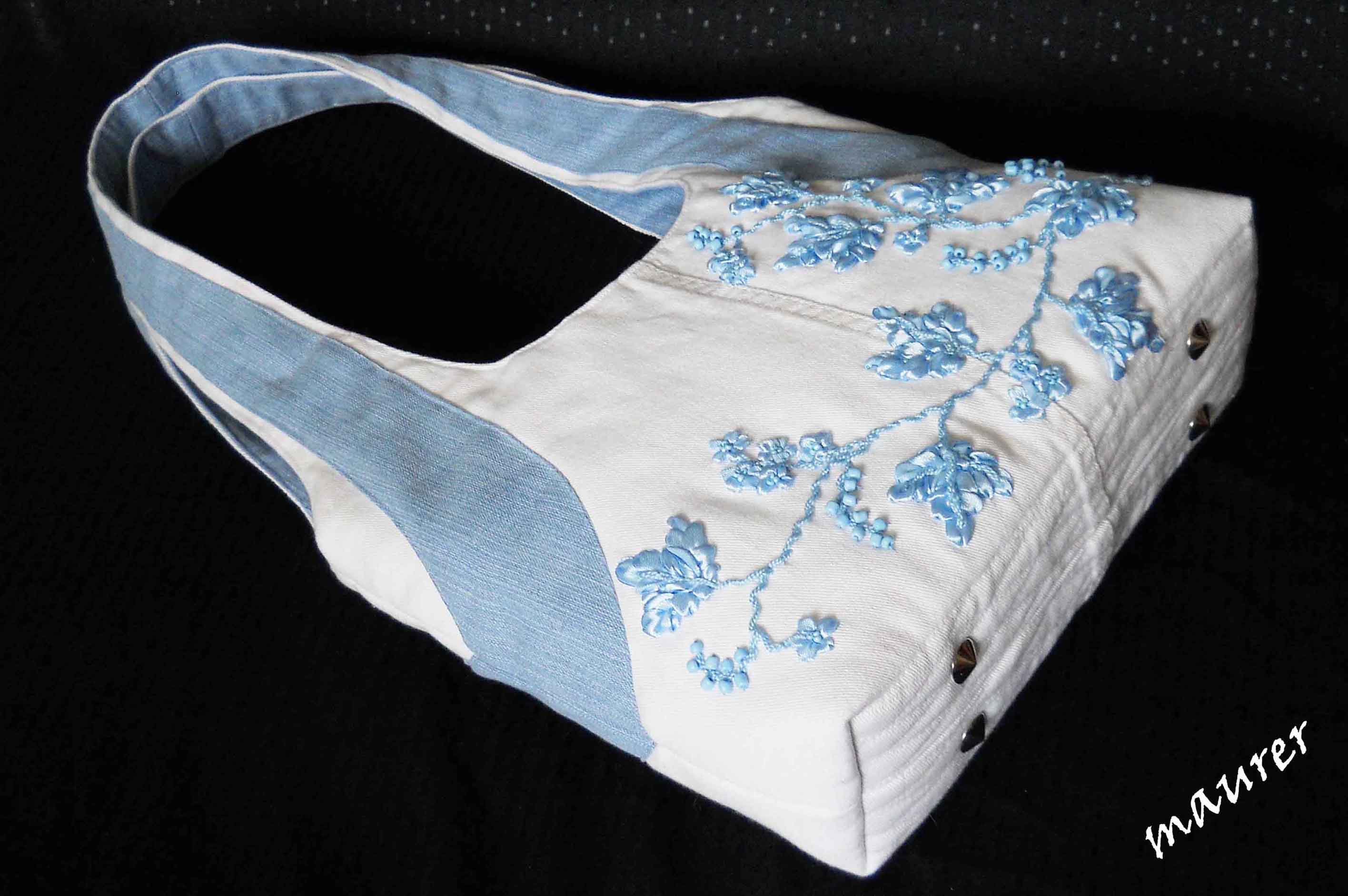 Сумка "Голубой рассвет" Размеры: высота-25,ширина-32,глубина-8,длина ручек-68. Материалы: джинс, поплин. Авторская вышивка лентами, использованы нитки ирис, бусины. Одно отделение на молнии. На подкладке три кармана: накладной на резинке для мобильного телефона, прорезной в рамочку на молнии и маленький накладной под поводком, что б прятать ключи. На поводке хромированный карабинчик. Сумку можно стирать, утюжить. Вложение:
