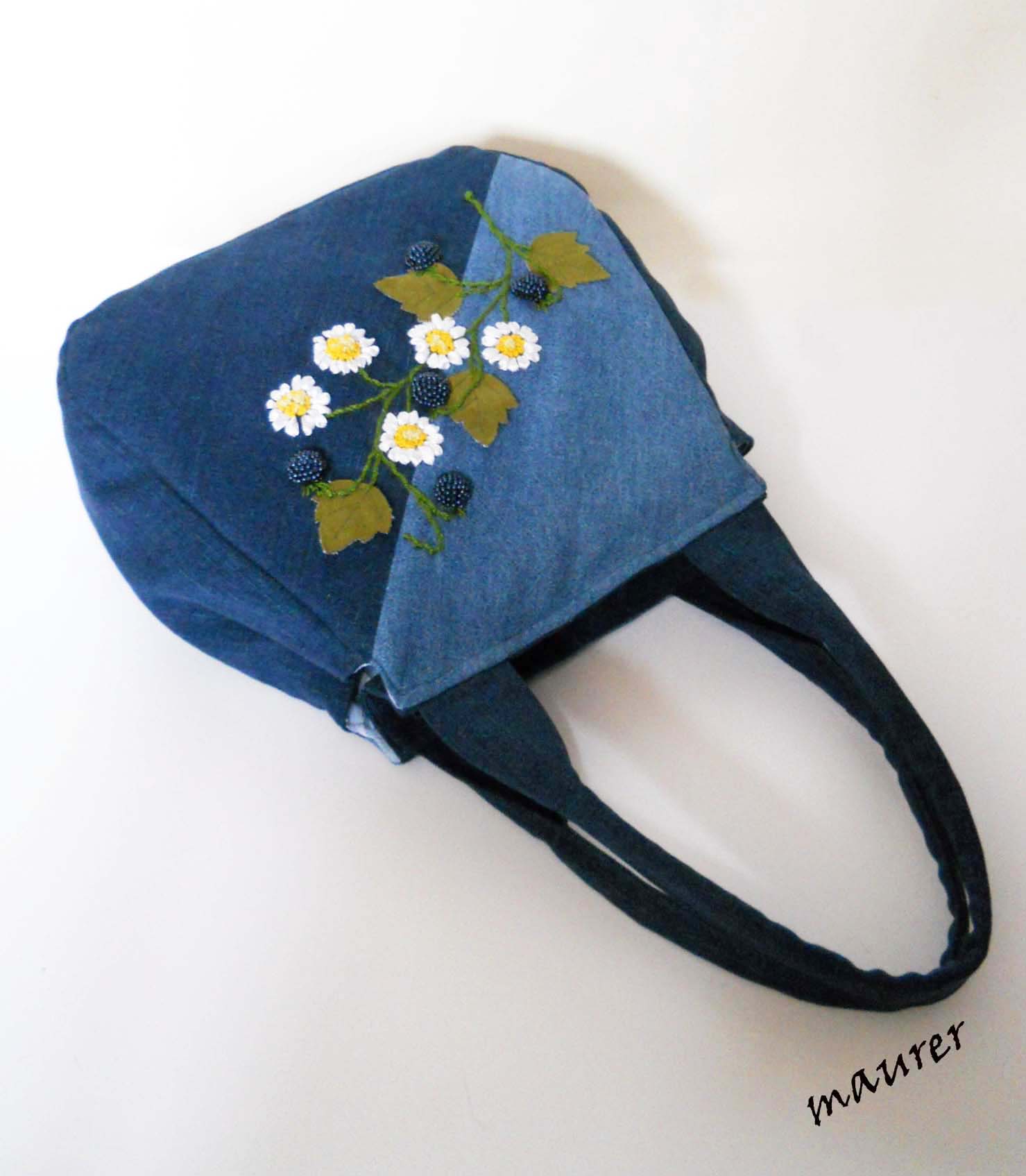 Джинсовая сумка. Размеры: высота-31,длина-34,ширина-13, ручки-58см. Подкладка хлопок. Накладной карман на резинке и карман на молнии. Листья замш аппликация. Объемные ягодки из бус и вышивка атласными ленточками и нитками ирис. Вложение: