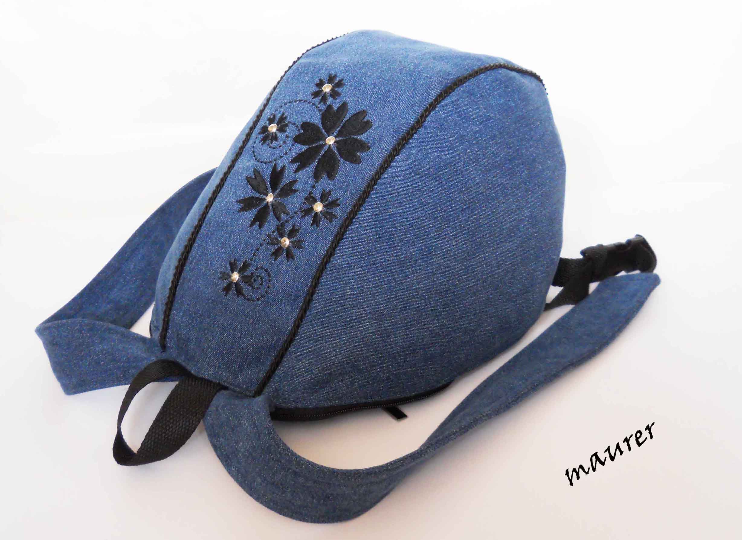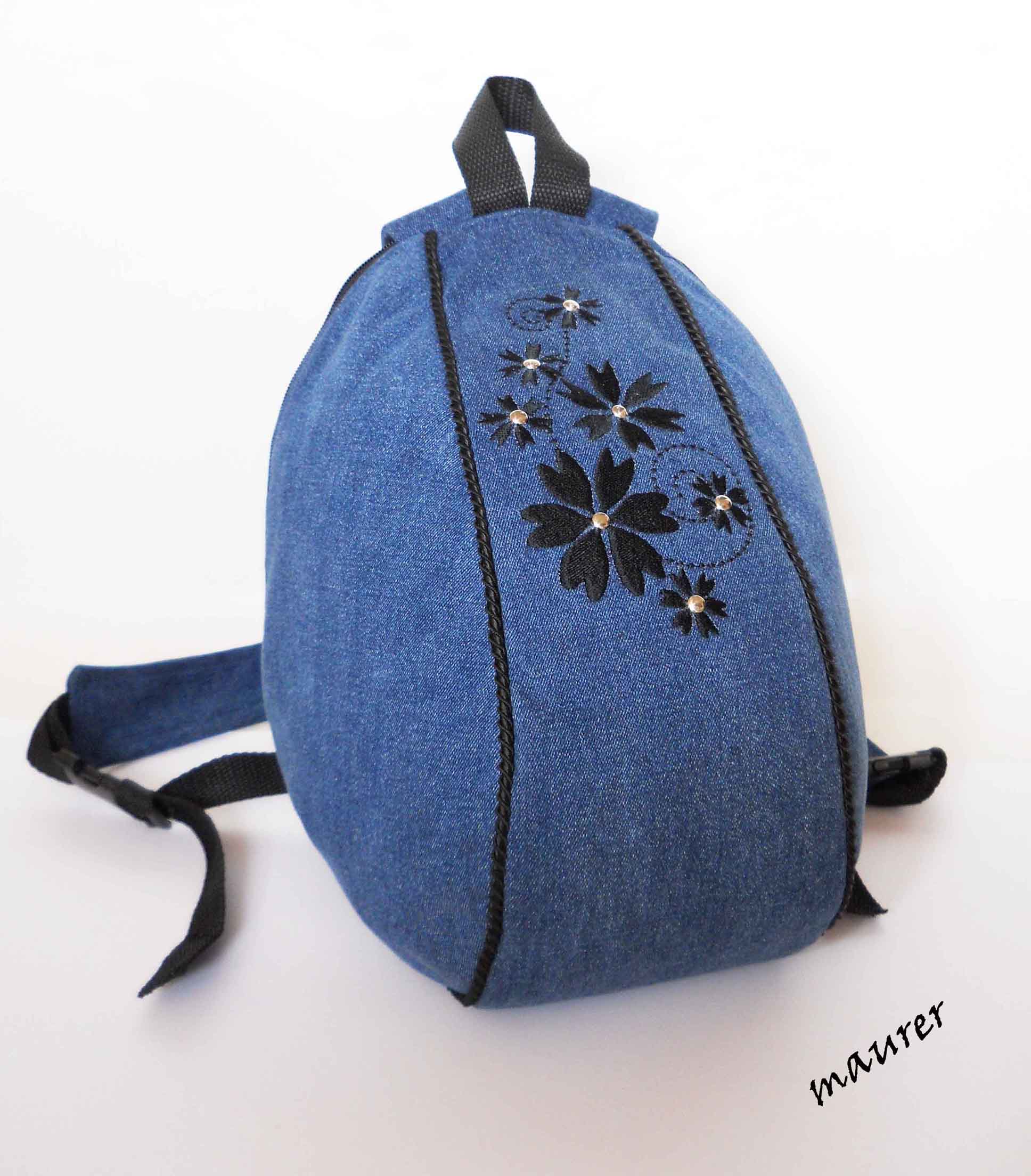 Джинсовый рюкзак. Размеры: 25х22х32. Лямки регулируются. Большой внешний карман на задней стенке, закрывается на молнию. Внутренний небольшой карманчик. Материалы: джинс, хлопок, ременная лента. Машинная вышивка на передней части, создана специально для этой работы. Металлические заклепки. Небольшой, но вместительный рюкзак. Вложение: