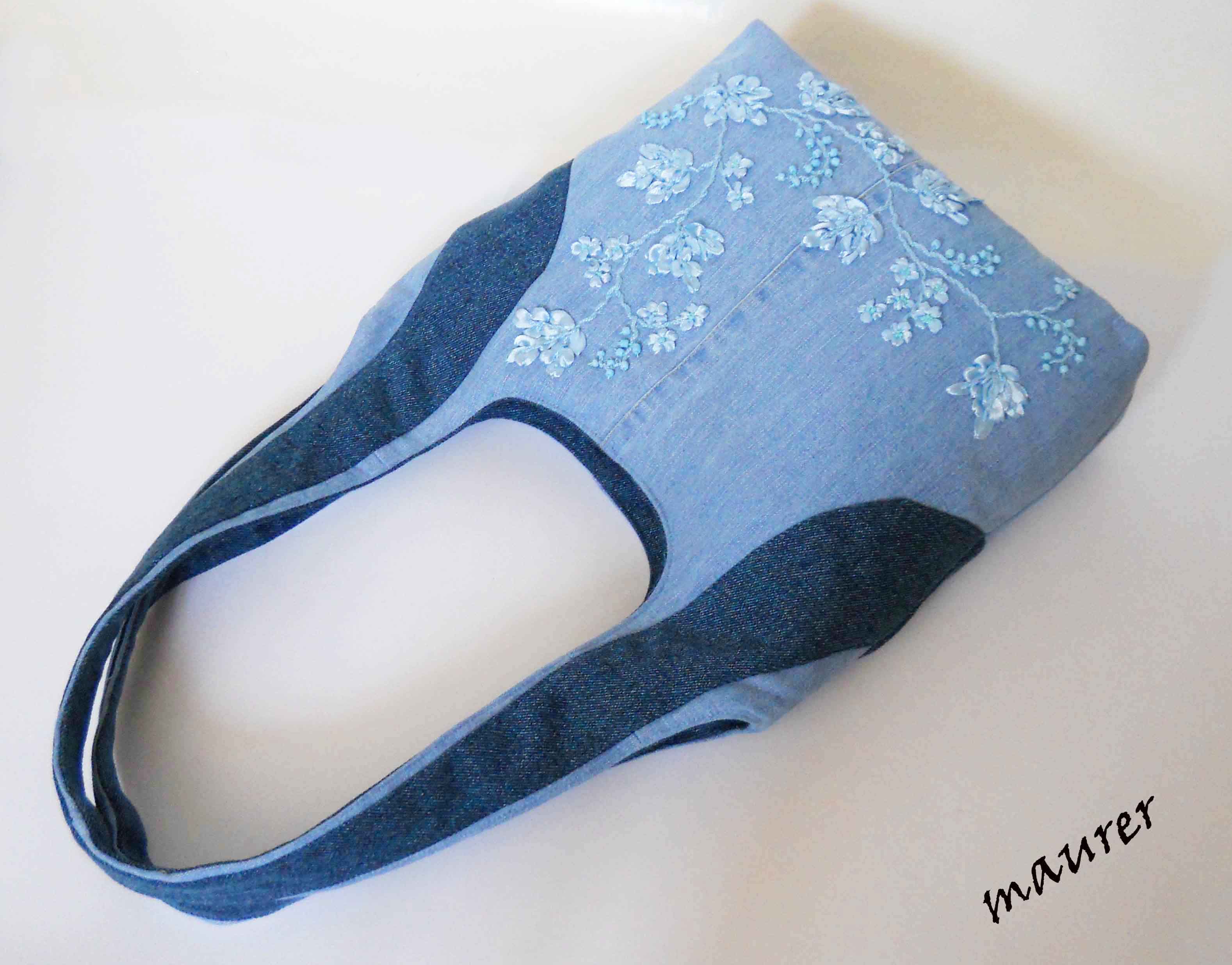 Сумка "Голубой рассвет" Размеры: высота-25,ширина-32,глубина-8,длина ручек-68. Материалы: джинс, поплин. Авторская вышивка лентами, использованы нитки ирис, бусины. Одно отделение на молнии. На подкладке три кармана: накладной на резинке для мобильного телефона, прорезной в рамочку на молнии и маленький накладной под поводком, что б прятать ключи. На поводке хромированный карабинчик. Сумку можно стирать, утюжить. Вложение: