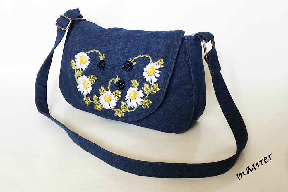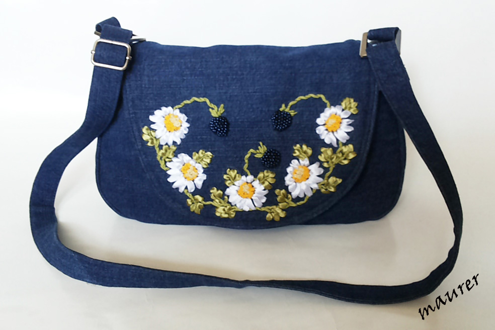 Cумка кросс-боди. Материалы: джинс, хлопок. Вышивка атласными лентами, нитками ирис, бусинками. Одно отделение на магнитной кнопке. Внутри накладной карман на резинке. Сзади карман на молнии. Сумку можно носить в руках, на плече и через торс. Ручка регулируется по длине. Размеры: высота 20, длина 31, ширина 7, ручка max 96см. Вложение: