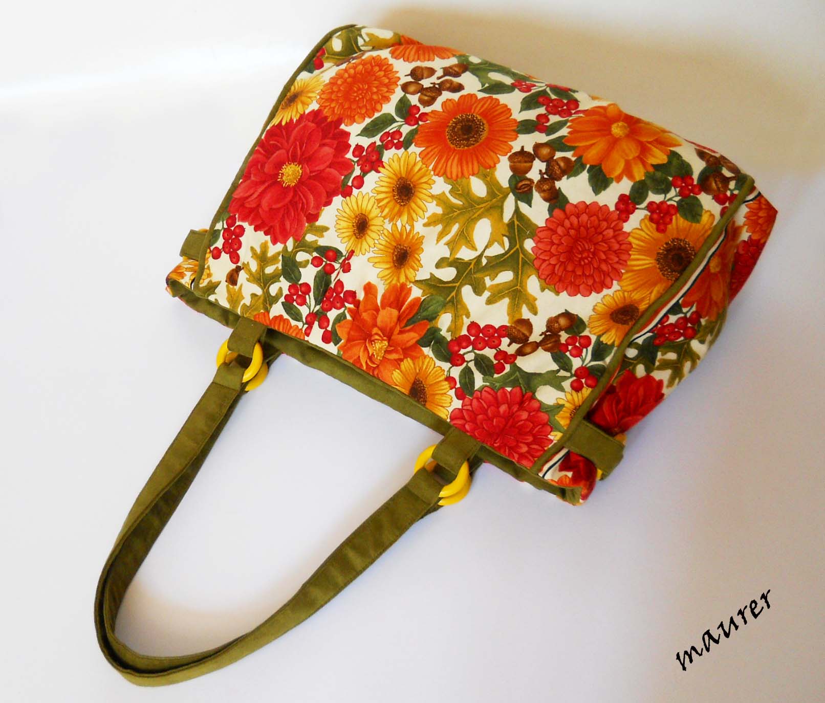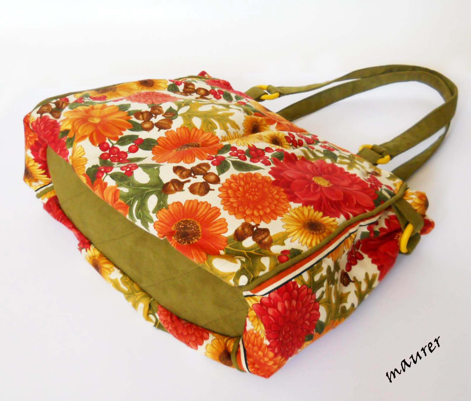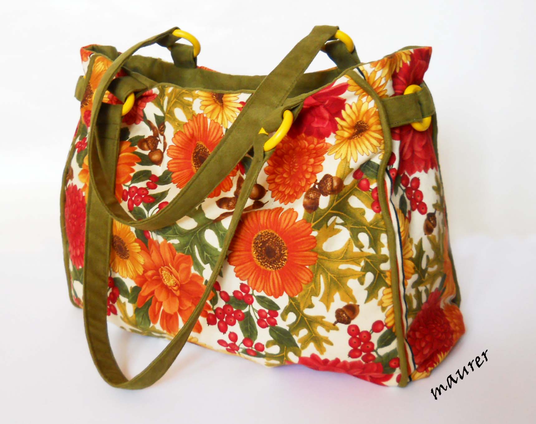 Летняя сумочка "Вересень".Размеры: высота-27, длина-37, ширина-13, ручки-59см. Материалы: американский хлопок, искусственная замша, деревянные кольца. Подкладка искусственный шелк(цвет зеленый, но на фото упорно выглядящий серым). Одно отделение на молнии. На подкладке два кармана. Вложение: