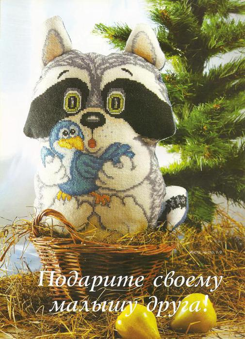 Эта первая детская игрушка, вышитая крестом, которую я увидела. И мне она очень сильно понравилась. Вышивается все на обычной канве, потом делаются по вышивке выкройки, все сшивается и наполняется внутри ватой или поролоном. Не правда ли симпатичный енот? Есть схема вышивки.