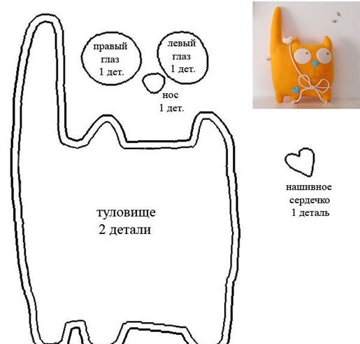 Нашла простенькую выкройку игрушки из фетра - вот такого симпатичного влюбленного котика. Потребуется фетр двух цветов, нитка, ножницы, вата или синтипон. Необходимо вырезать из фетра 2 детали туловища. С фетра другого цвета вырезать мелкие детали. К одной из сторон туловища пришить нос, глаза, сердечко. Повышивать реснички-усики. Сшить две стороны туловища между собой, оставим небольшую дырочку, чтобы вывернуть. Наполнить ватой и зашить до конца. Можно украсить ленточкой или другими аксессуарами.