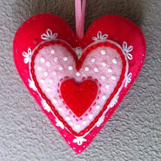 На день влюбленных можно сделать вот такие валентинки своими руками из фетра. Фетр можно купить одного-двух цветов - красного и розового. Потребуются также нитка красного цвета и по желанию бисер или другие бусины для украшения.