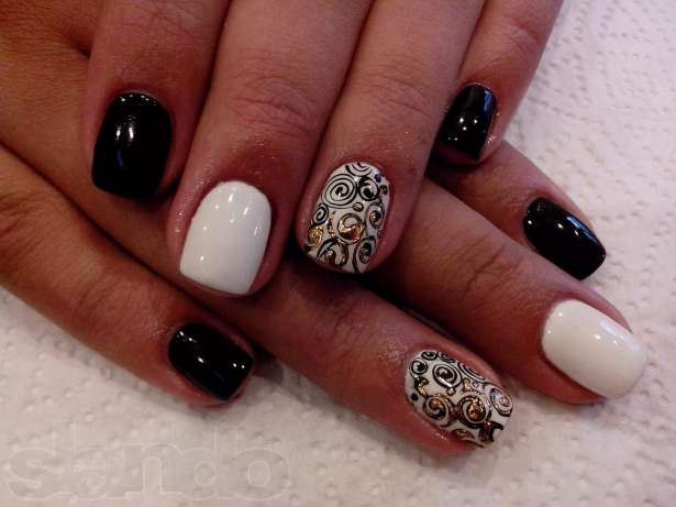 Мне понравился маникюр на втором фото, где на безымянном завитки золотые. Но я бы не красила средний ноготь в кардинально белый цвет, что то выбрала нежнее, может темный беж или кофе с молоком......