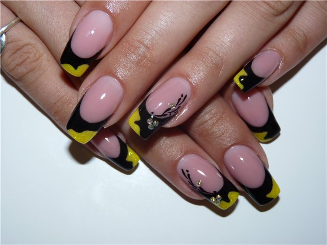 Пусть это будет очень таки банально, но мне больше бы понравился обычный белый френч с такими розовыми цветочками, как на этом маникюре, мило и красиво, если на каждый день, а вот на праздник можно и с черным как-то поэкспериментировать.