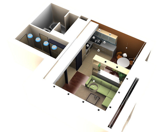Неплохой вариант. Очень светлый. Понятно, что это компьютерный рисунок, и в жизни, добавив небольшие детали в виде картин, бра, статуэток, квартирка получилась бы симпатичной. Учитывая, что сейчас много однокомнатных квартир именно такого плана постройки, то этот вариант интерьера довольно актуален сейчас.