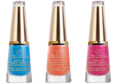 • база для макияжа губ Collistar Lip Primer Fixer, закрепляет помаду и разглаживает поверхность губ – цена €18.15 • помада для губ Collistar Icon Lipstick Gold, представлена в оттенках - №01 Petal Pink, №02 Nude Pink, №03 Magenta, №04 Cherry, №05 Peach Flower, №06 Icon Pink – цена €23.10 • лак для ногтей Collistar Perfect Nails Enamel, который быстро наносится и так же высыхает. Оттенки : №88 Sky, №89 Apricot, №90 Strawberry – цена €14.15