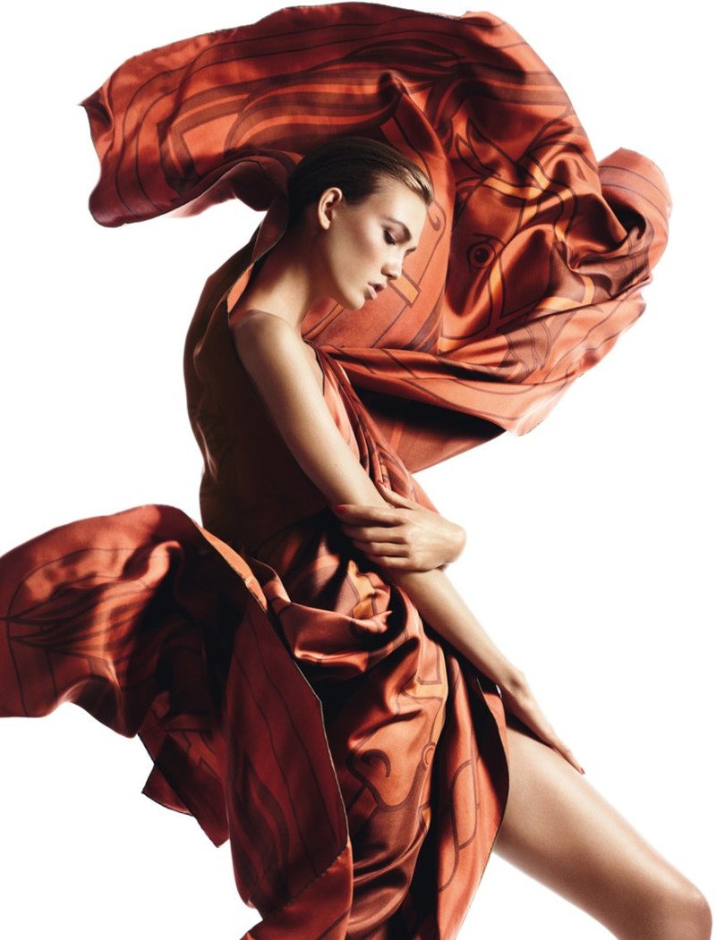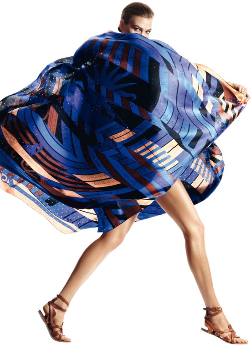 Популярный, в мире моды, бренд Hermes представил коллекцию ультра-модных платков сезона весна-лето 2013. В рекламной кампании новой линейки снялась американская модель Карли Клосс (Karlie Kloss). Фотограф Дэвид Симс запечатлел модель в движении, на фото девушка выглядит динамично, красиво, энергично. Каждое движение Клосс превращает платок из простого отреза таки, в нечто живое и самодостаточное. Платки от Hermes, как всегда пестрили яркими цветами, замысловатыми принтами и сказочными картинками. В общем, каждая из нас сможет подобрать, что - либо подходящее для себя в этой коллекции. Смотрим.