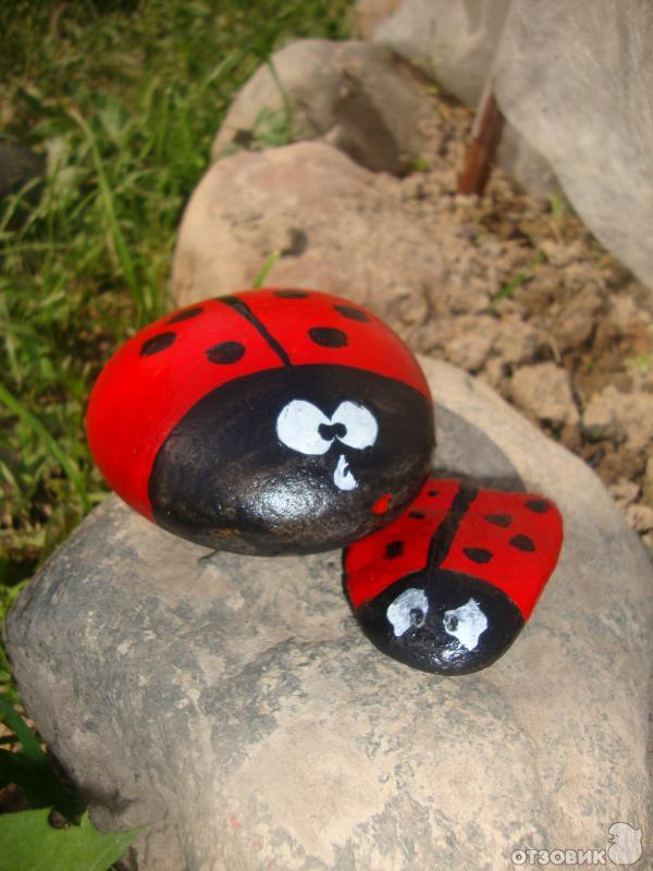 Тоже классная идея! Мне понравилось. А еще мне понравилось как делают разные поделки из камней для украшения сада, клумб. Например, вот такие божьи коровки из округлых булыжников. Такое задание по раскрашиванию можно и детям поручить.