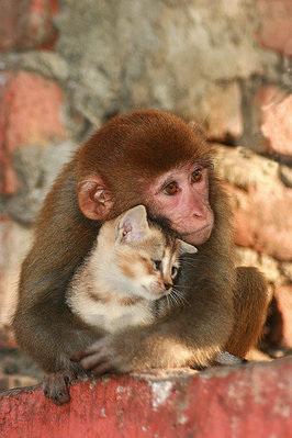 Меня удивила мама собака и детеныш тигренок, а также какая нежная обезьянка, так уж трепетно голубя обняла.