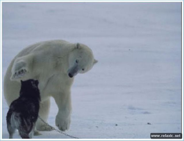 Перед вами уникальные снимки, сделанные фотографом Норбертом Розингом (Norbert Rosing) на севере Канады возле Гудзонова залива. Норберт остановился на привал вместе с собачьей упряжкой, когда неожиданно из снежной пелены появился белый медведь. Казалось, что нападение дикого хищного зверя неминуемо, но тут случилось невероятное – медведь приблизился к собакам и начал с ними играть! На протяжении всего времени стоянки, которая продолжалась несколько дней, медведь наведывался в гости и с удовольствием проводил время в обществе собак.