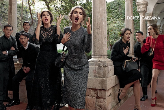 Чтобы отвлечь внимание от недавнего скандала, известный итальянский дизайнерский дуэт Dolce&Gabbana, выпустил новую промокампанию. Напомню, что дизайнеров судили за отклонение от уплаты налогов (подробней об это читайте в теме). Бренд представил мужскую коллекцию сезона осень-зима 2013-2014, в рекламе которой приняли участие такие знаменитые звезды, как Бьянка Балти и Моника Беллуччи. Рекламная кампания была сделана в стиле сицилийской мафии, невольно на ум приходят ассоциации с крестным отцом и его Семьей. Мужчины, одетые в строгие черные костюмы из новой коллекции, рядом с ними шикарные женщины, в таких же сногсшибательных нарядах, вместе они смотрятся потрясающе. В общем рекламная кампания удалась, как и стоило ожидать. Бьянка Балти и Моника Беллуччи вместе с моделями Андреа Диакону и Кейт Кинг, продемонстрировали все грани чувств, по-итальянски преувеличенно и при этом не теряя грациозности и шика.