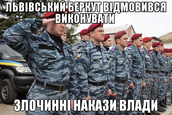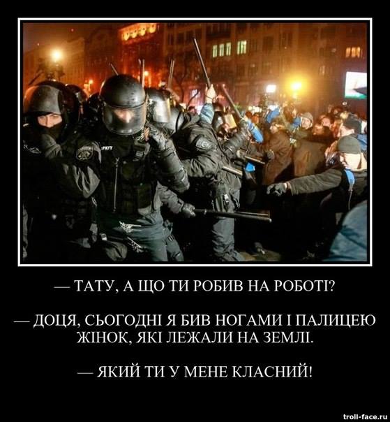 Mila21 писал(а): Не надо тут никого обсерать. У каждого свое мнение и точка. Нет мне не жалко только тех людей, мне жалко беркутят у которых дома семьи, мне жалко милицию, которую драконили. Ну играли и доигрались. милиция просто так по голове не настучит. Міла, так як Ви вже всіх обсираєте, то тут ніхто цього не робить (я ледь себе стримала, щоб не нагрубити Вам про будівельників із Західної України). А міліція у нас свята  тут Ви, як ніколи праві  певно всі учасники цього форуму погодяться з таким, Вашим!!! твердженням
