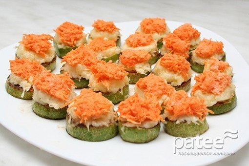 Начинается сезон кабачков, вот замечательная и вкусная закуска Кабачки с сыром и морковкой, для этого нам нужно 2 кабачка нарезать кружочками по 1,5 см и обжарить, натереть на терке желтый сыр (200 гр), смешать с майонезом и чесноком, натереть на мелкой терке морковь (1 большую) и тоже смешать с майонезом и чесноком. Далее выкладываем на тарелку кабачки, сыр и морковь.