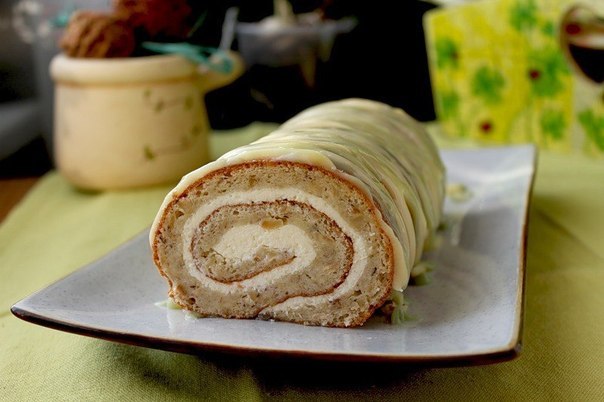Пирог-рулет с творогом Для начала нам нужно взбить 400 гр мягенького творога, яйцо, 100 гр сахара и 3 ст.л молока. Все выливаем в форму застеленную бумагой. Далее разделяем 3 яйца, желтки взбиваем, потом добавляем 2 ст.л сахара и снова взбиваем. Отдельно мелко рубим 50 гр орехов, толчем в кашицу 1 банан и все соединяем, добавляем к желткам и вымешиваем, туда же нужно добавить 3 ст.л муки и пол ч.л разрыхлителя. Оставшиеся 3 белка нужно взбить и аккуратно добавить в тесто. Теперь тесто выкладываем на творожную массу и разравниваем ложкой, все выпекаем 20 минут. Вынимаем все из духовки и выкладываем на полотенце посыпанное сахарной пудрой, скручиваем рулет творогом внутрь.