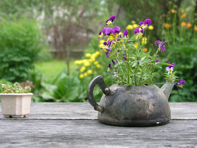 Мне понравилось. Если места на участке немного, то это хороший вариант, чтоб разместить небольшие цветочки. А еще мне нравиться идея с использованием старого чайника вместо горшка. Оригинально.