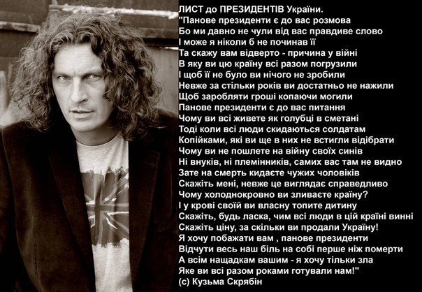 Какой ужас  , я не могу поверить, этот человек любил правду, был хорошим певцом, так жаль. А вот кстати письмо. Лист до президентів України Панове президенти є до вас розмова Бо ми давно не чули від вас правдиве слово І може я ніколи б не починав її Та скажу вам відверто - причина у війні В яку ви цю країну всі разом погрузили І щоб її не було ви нічого не зробили Невже за стільки років ви достатньо не нажили Щоб заробляти гроші копаючи могили Панове президенти є до вас питання Чому ви всі живете як голубці в сметані Тоді коли всі люди скидаються солдатам Копійками, які ви ще в них не встигли відібрати Чому ви не пошлете на війну своїх синів Ні внуків, ні племінників, самих вас там не видно Зате на смерть кидаєте чужих чоловіків Скажіть мені, невже це виглядає справедливо Чому холоднокровно ви зливаєте країну? І у крові своїй ви власну топите дитину Скажіть, будь ласка, чим всі люди в цій країні винні Скажіть ціну, за скільки ви продали Україну! Я хочу побажати вам , панове президенти Відчути весь наш біль на собі перше ніж померти А всім нащадкам вашим - я хочу тільки зла Яке ви всі разом роками готували нам! (с) Кузьма Скрябін