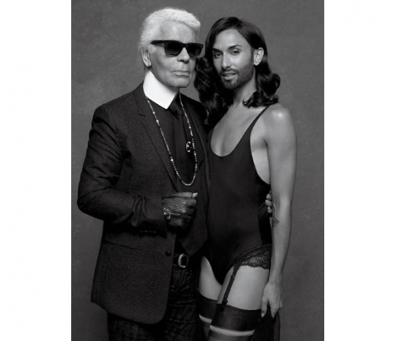 Нашумевшая во всем мире персона, Кончита Вурст, которая выиграла Евровидение 2014 продолжает покорять или лучше сказать потрясать вселенную шоу бизнеса. На сей раз "бородатая женщина" попала в объектив камеры самого Карла Лагерфельда. С легкой руки модельера Кончита стала стала главной fashion-музой современности. Все снимки выдержаны в черно-белом цветовом решении. Вместе с Вурст позирует Карлу в белье и чулках от Givenchy и беременная новозеландская модель Эшли Гуд (Ashleigh Good). По всей видимости, модельер решил в своем проекте совместить несовместимое.