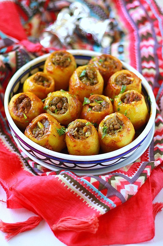 Я брала аж 2 кг картошки, почистила, помыла, срезала низ, чтоб каждый картофель мог стоять, вырезала ножом дырки и оставила высохнуть. На сковороде обжарила 2 луковицы, добавила 500 гр смешанного фарша, специи, перемешала и обжарила все, а еще посолила, поперчила. Нафаршировала картофель фаршем. Блендером взбила 400 гр консервированных томатов, 3 зубчика чеснока, базилик, 3,5 ст воды, переложила в кастрюльку, дала соусу закипеть. В другой кастрюльке поставила фаршированный картофель, залила соусом, накрыла крышкой и оставила тушится на небольшом огне минут 15. Все легко и очень вкусно