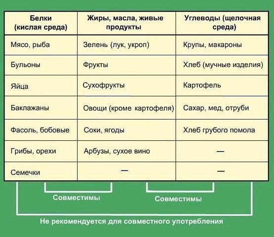 Главное правильно продукты сочетать правильно, вот интересная таблица сочетаемости продуктов, что и с чем можно кушать, а что нельзя